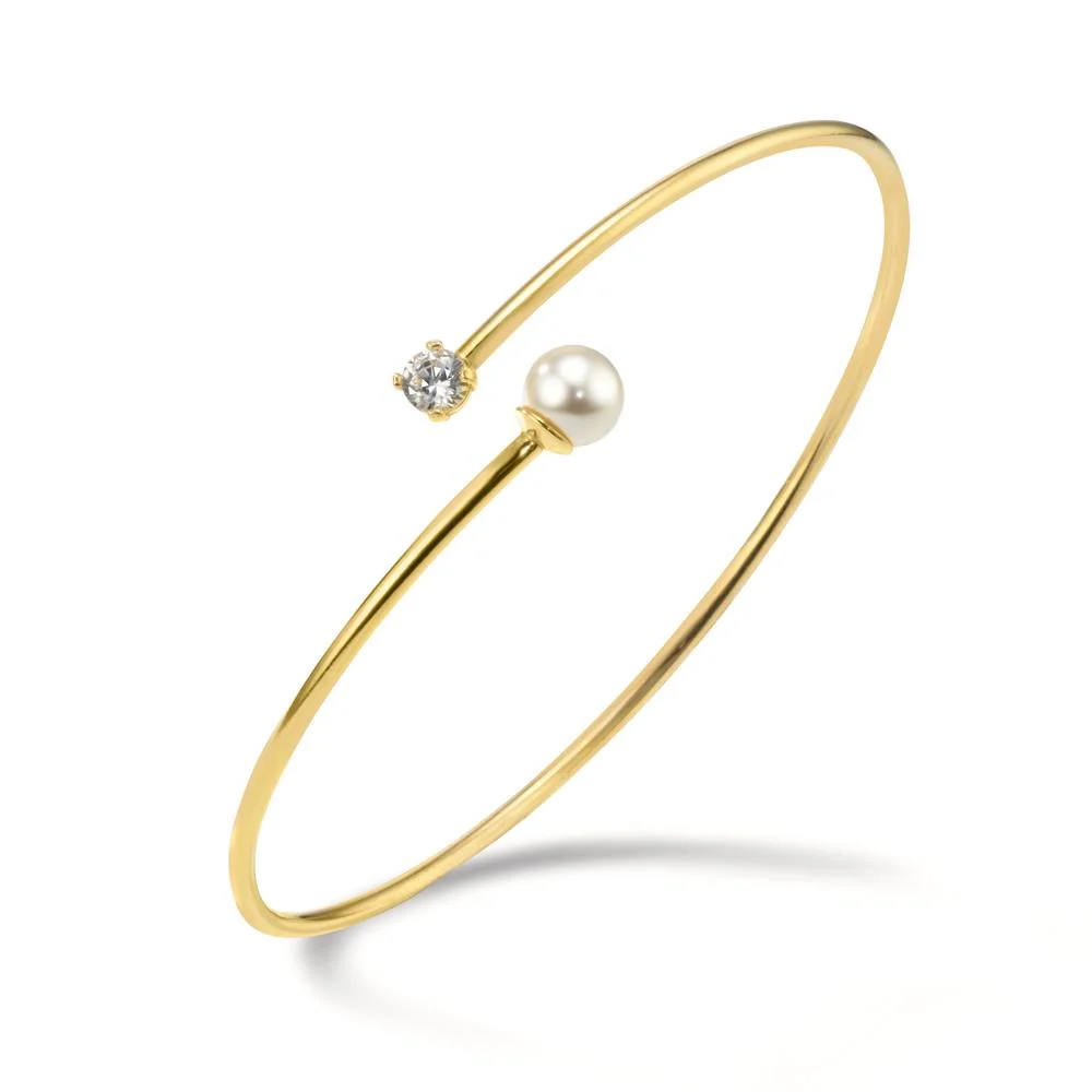 Bracciale da donna elegante in argento placcato oro, impreziosito da un raffinato zircone brillante e una perla luminosa. Design minimalista e sofisticato, perfetto per arricchire ogni outfit con un tocco di classe e femminilità. Ideale per occasioni speciali o uso quotidiano.