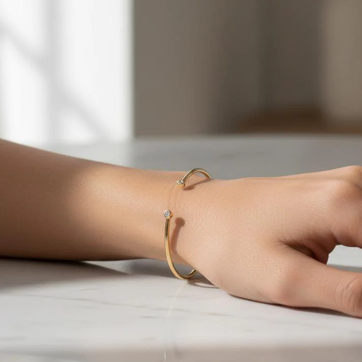 Bracciale da donna in bronzo placcato oro, elegante e raffinato. Il design sottile è arricchito da due scintillanti zirconi alle estremità, che donano luminosità e stile. Perfetto per ogni occasione, aggiunge un tocco di classe al tuo look quotidiano.